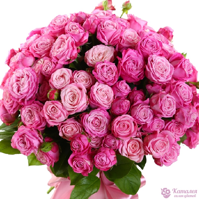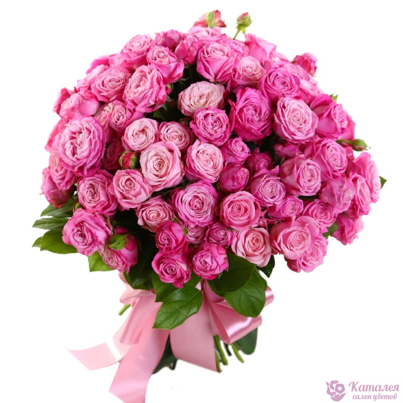 Букет состоит из 25 кустовых пионовидных роз, прозрачная упаковка, атласная лента.