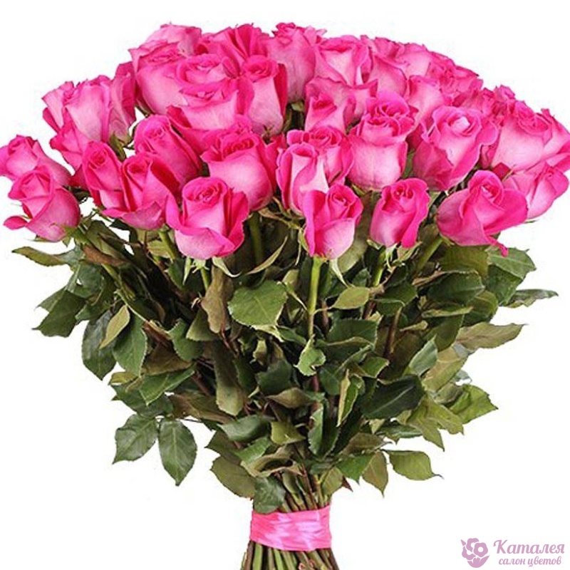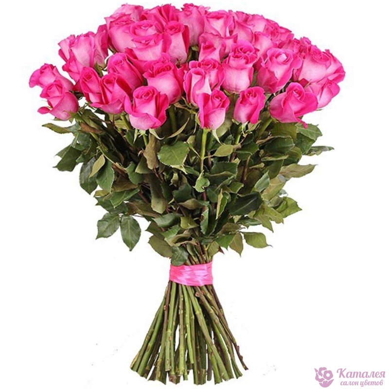 Букет состоит из 35 малиновых роз, прозрачная упаковка, атласная лента.