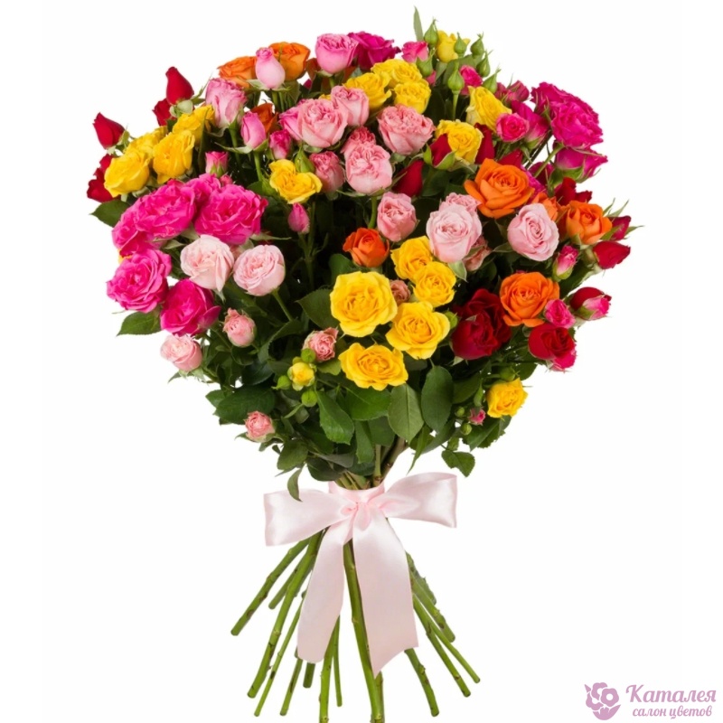 Букет состоит из MIX из 21 ветки кустовой розы, прозрачная упаковка, атласная лента.
