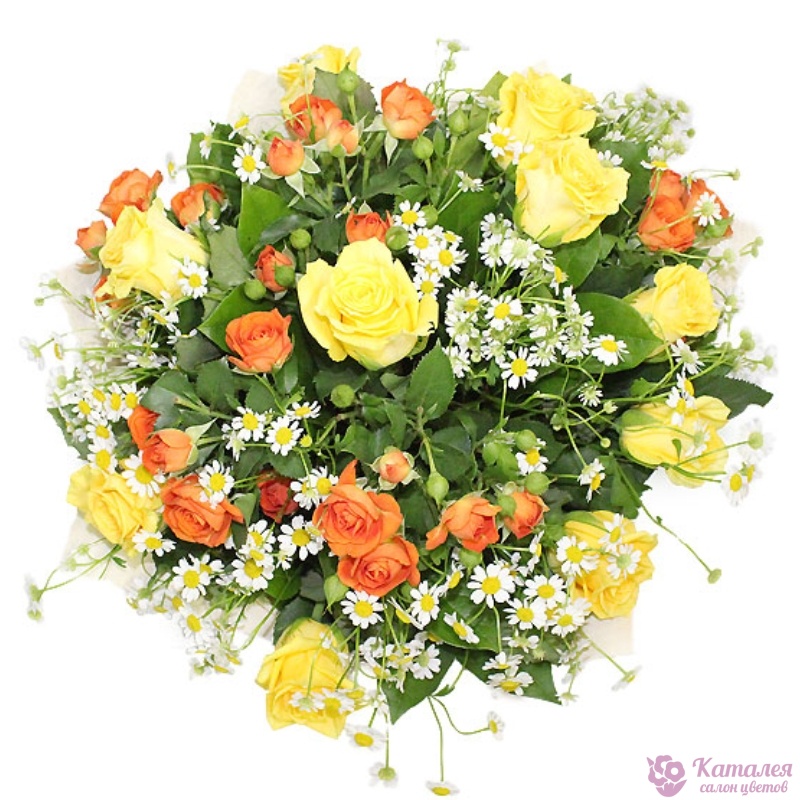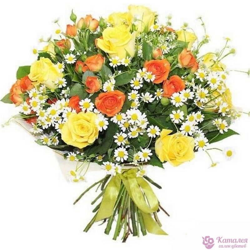 Букет состоит из 11 желтых роз, 6 кустовых оранжевых роз, 9 полевых ромашек, зелень, красивая упаковка, атласная лента.