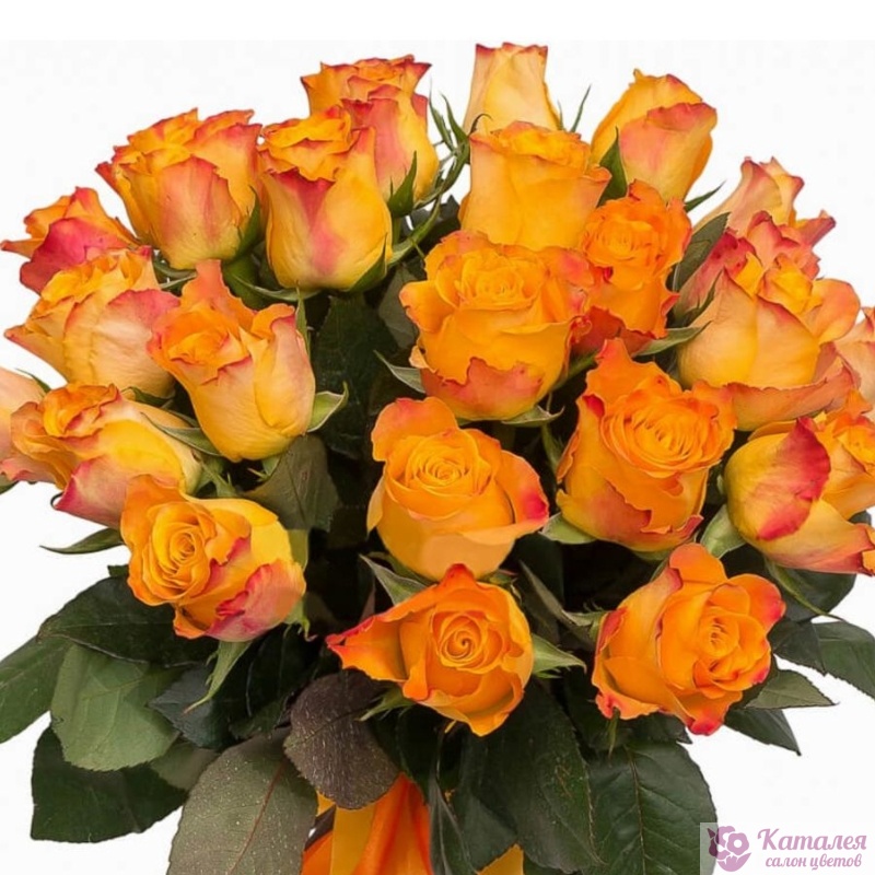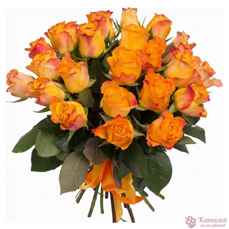Букет состоит из 21 оранжевая роза, прозрачная упаковка, атласная лента.