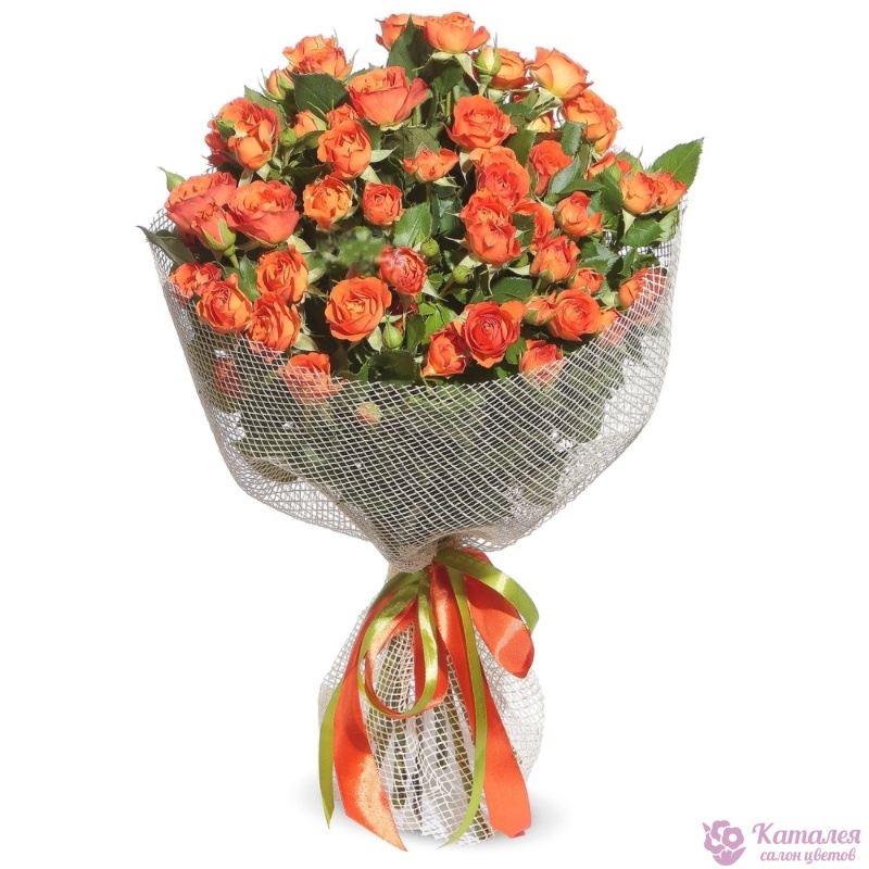 Букет состоит из 19 оранжевых кустовых роз, сетка, атласная лента.