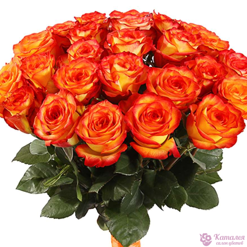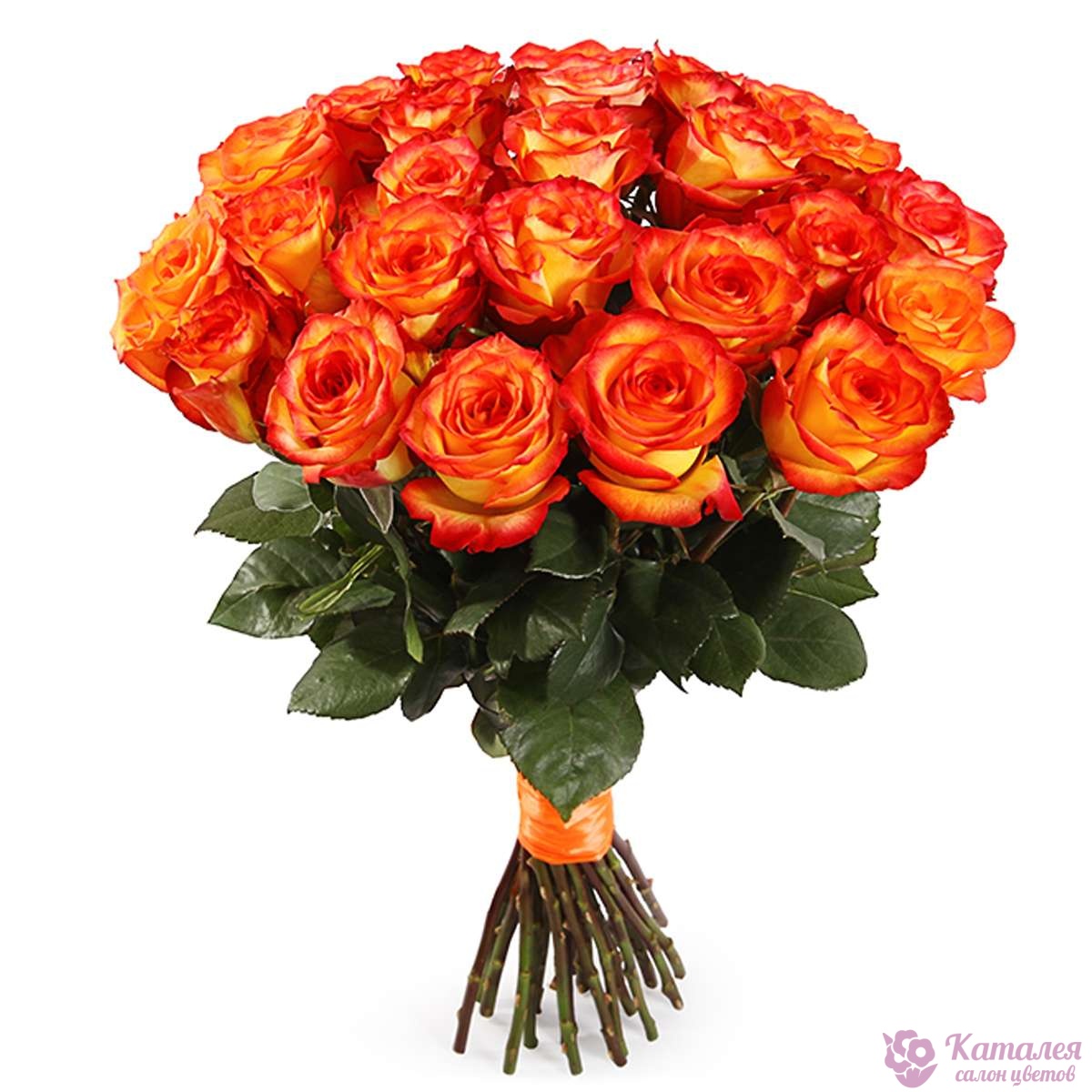 Букет состоит из 35 оранжевых роз, прозрачная упаковка, атласная лента.