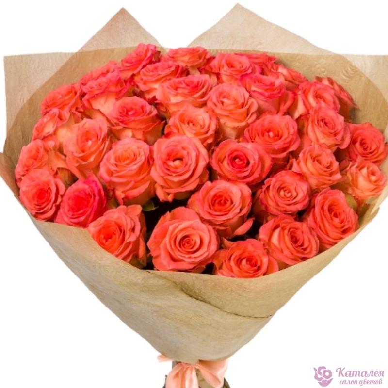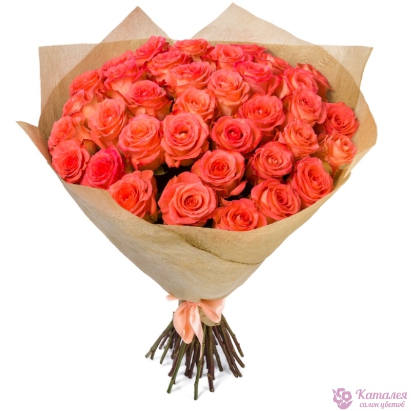 Букет состоит из 35 оранжевых роз, крафт, атласная лента.