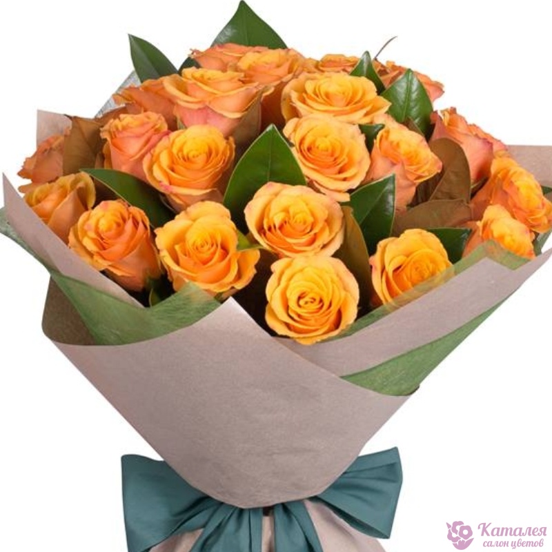 Букет состоит из 25 оранжевых роз, красивая упаковка, атласная лента.