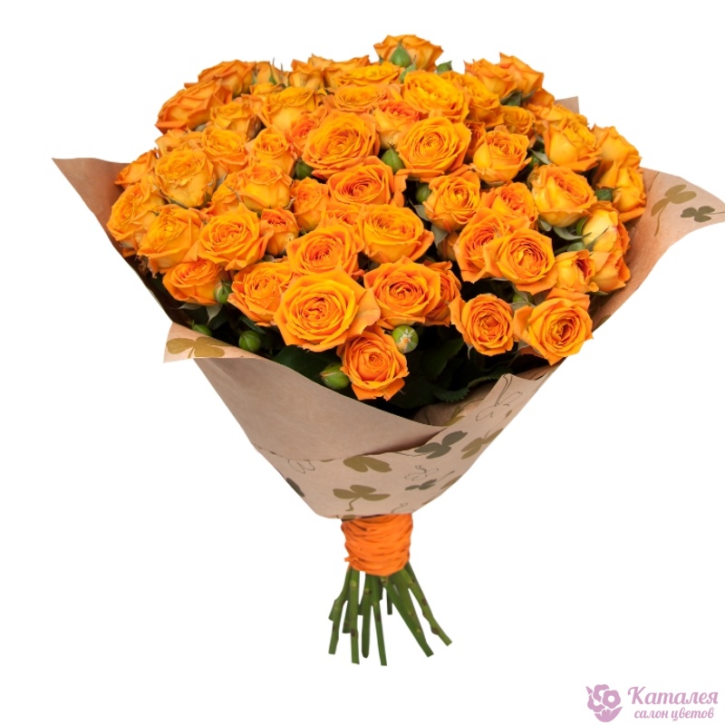 Букет состоит из 17 оранжевых кустовых роз, крафт, атласная лента.