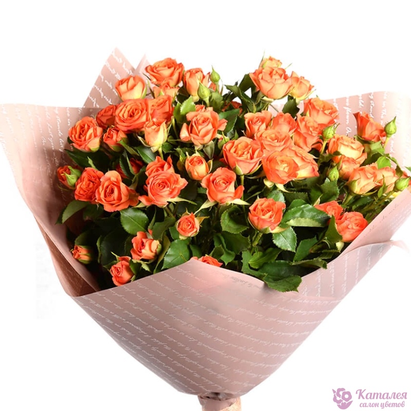 Букет состоит из 19 оранжевых кустовых роз, крафт, атласная лента.