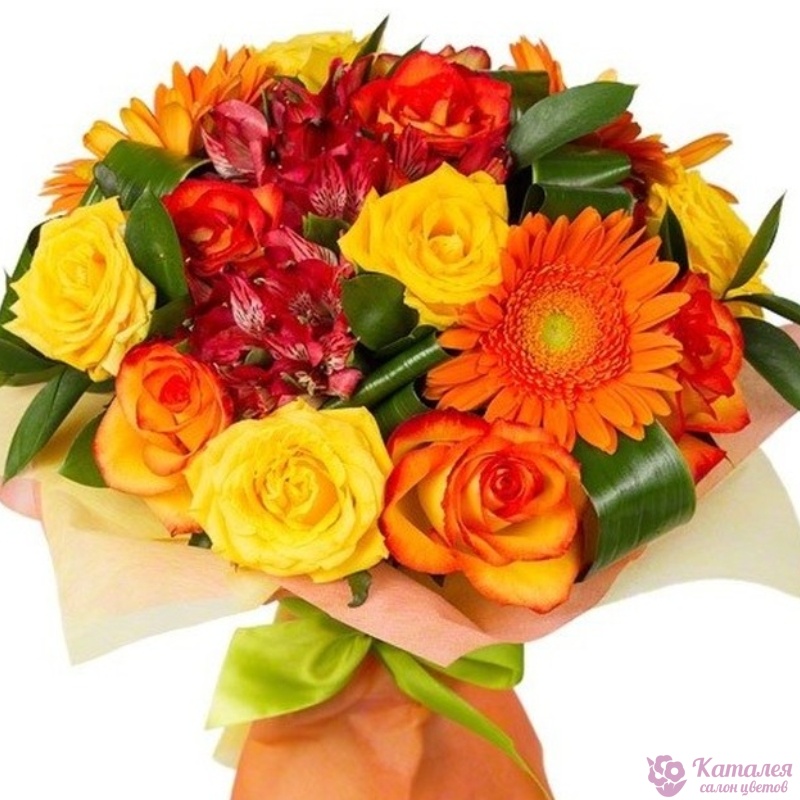 Букет состоит из 3 герберы, 11 роз, 5 альстромерий, аспидистра, рускус, красивая упаковка, атласная лента.
