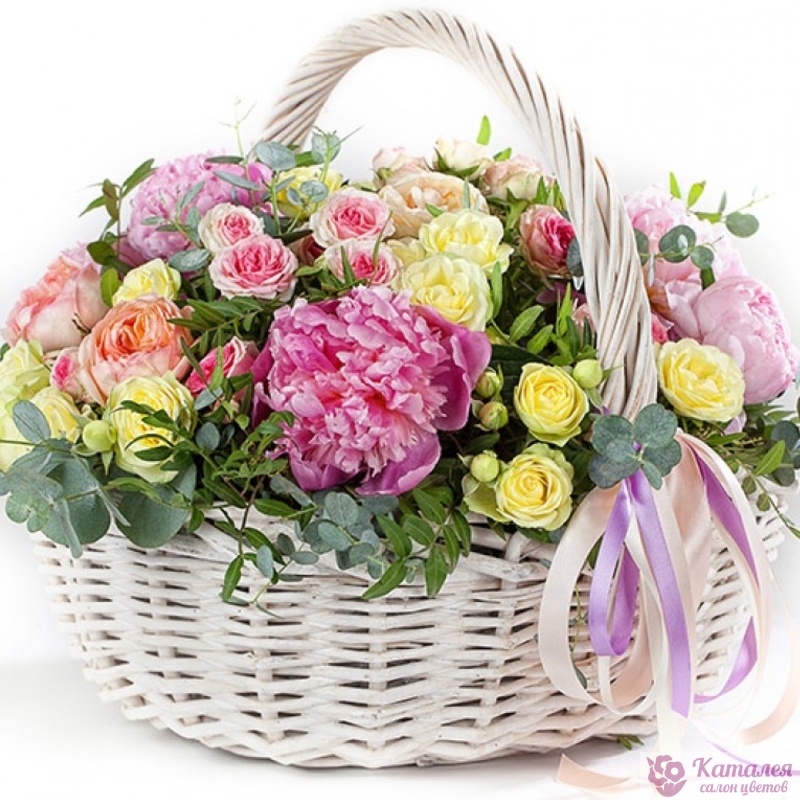 Букет состоит из 5 пионов, 5 пионовидных роз, 9 веток кустовых роз, зелень, корзина, оазис.