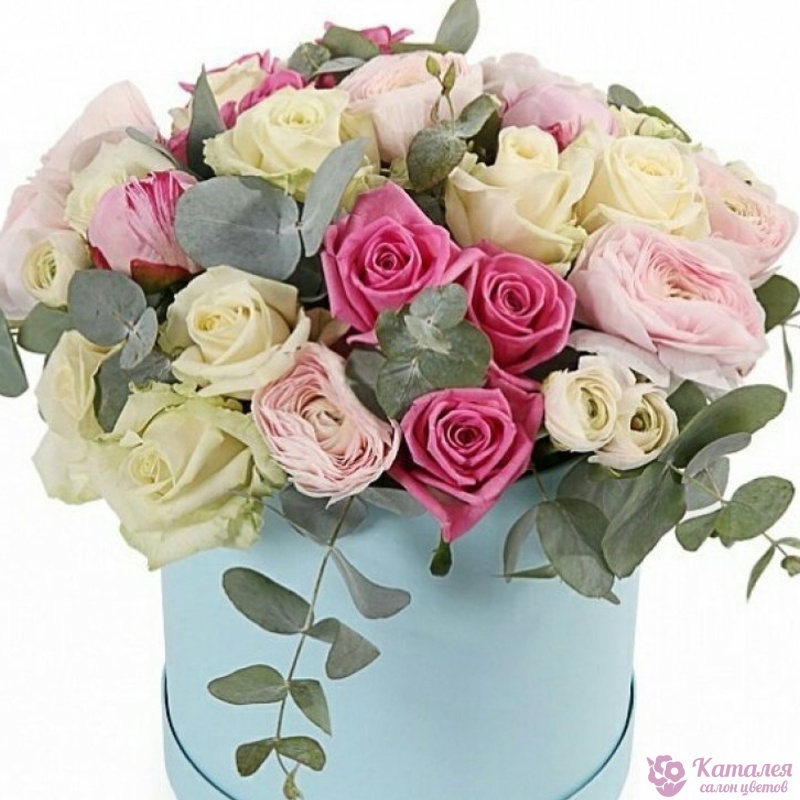 Букет состоит из 17 роз, 9 ранункулюсов, 3 пионовидные розы, эвкалипт, коробка, оазис.