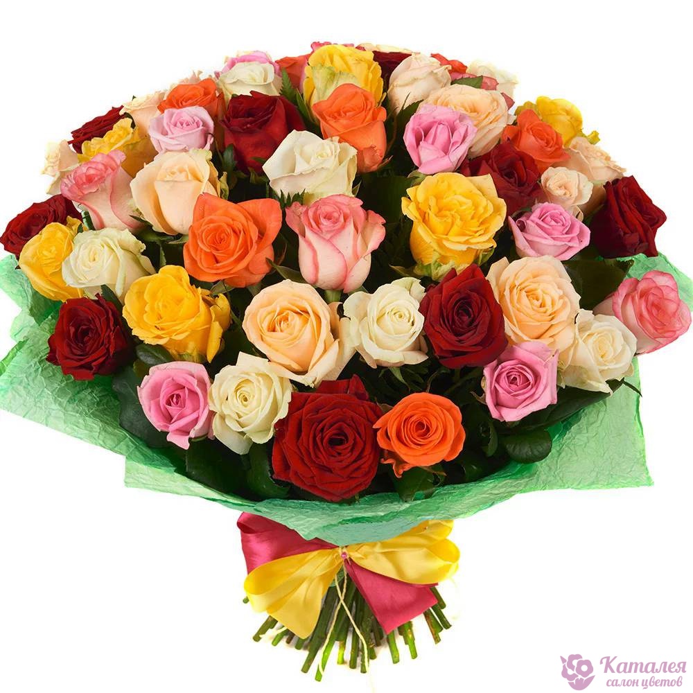 Букет состоит из MIX из 55 роз разных цветов, красивая упаковка, атласная лента.