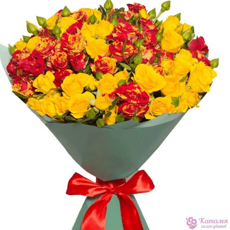Букет состоит из MIX из 21 желтой и красной кустовой розы, красивая упаковка, атласная лента.