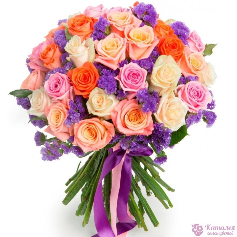 Букет состоит из MIX из 45 роз, 7 статица, прозрачная упаковка, атласная лента.