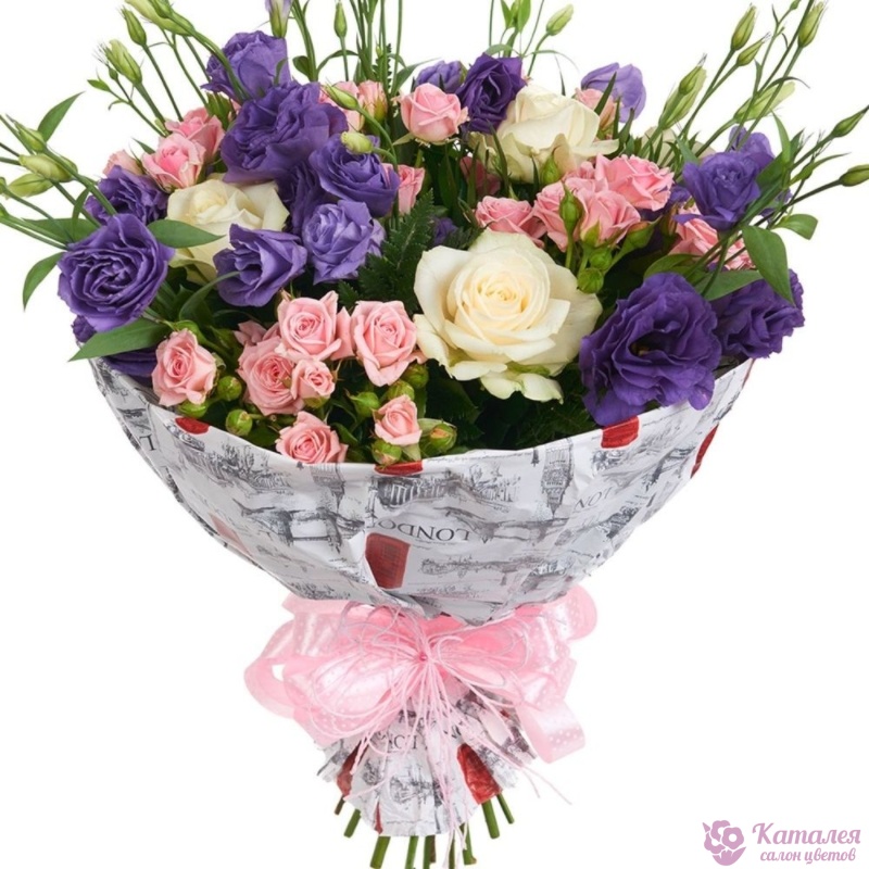 Букет состоит из 3 белые розы, 5 розовых кустовых роз, 5 веток эустомы, зелень, красивая упаковка, атласная лента.
