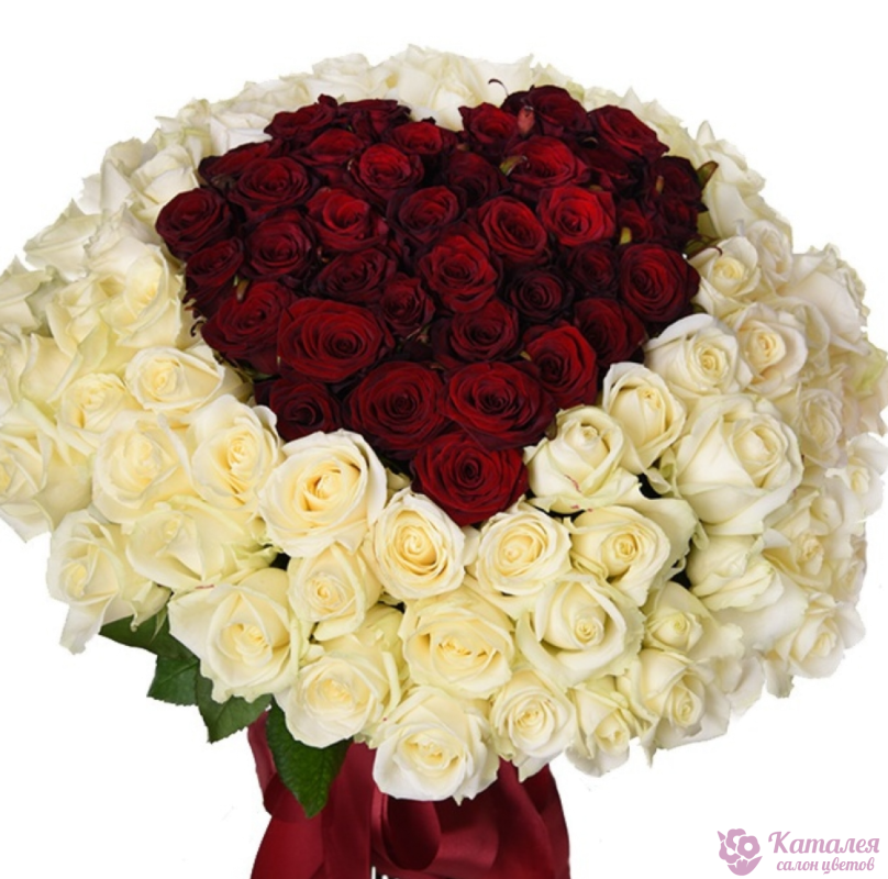 Букет состоит из 101 белая и красная роза, прозрачная упаковка, атласная лента.