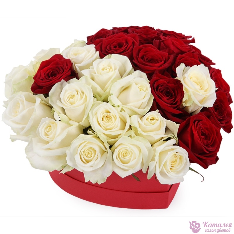 31 красная и белая роза, коробка в виде сердца.