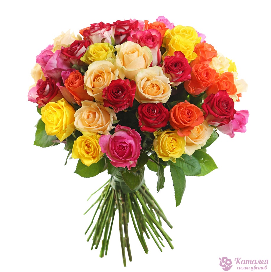 Букет состоит из MIX из 41 красной / оранжевой / розовой и желтой розы Кения, прозрачная упаковка, атласная лента.