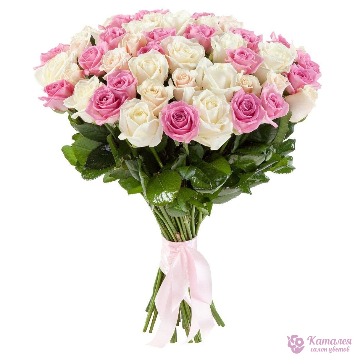 Букет состоит из 26 белых роз, 25 розовых роз, прозрачная упаковка, атласная лента.