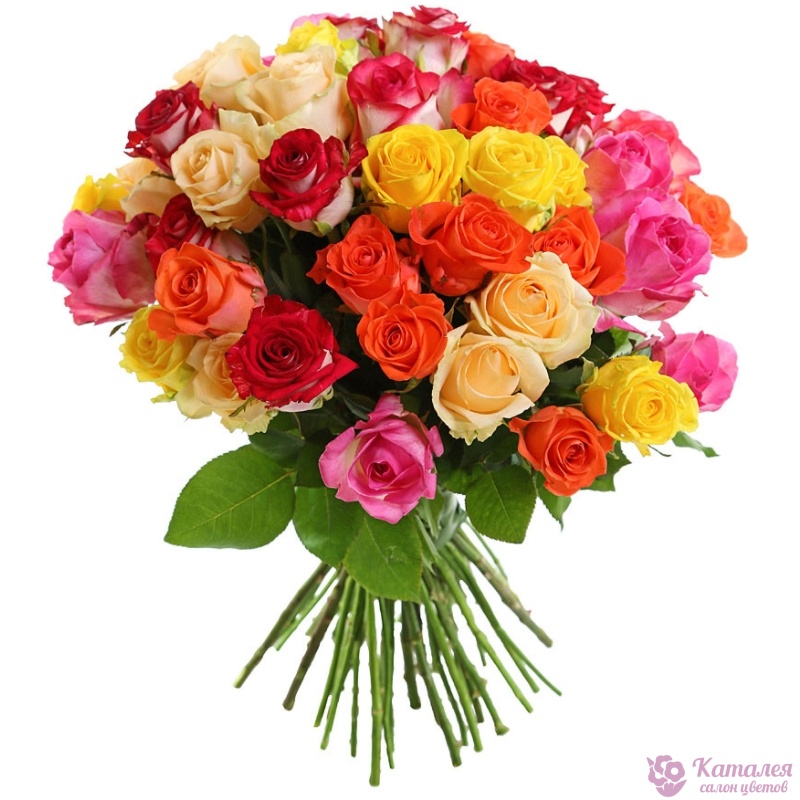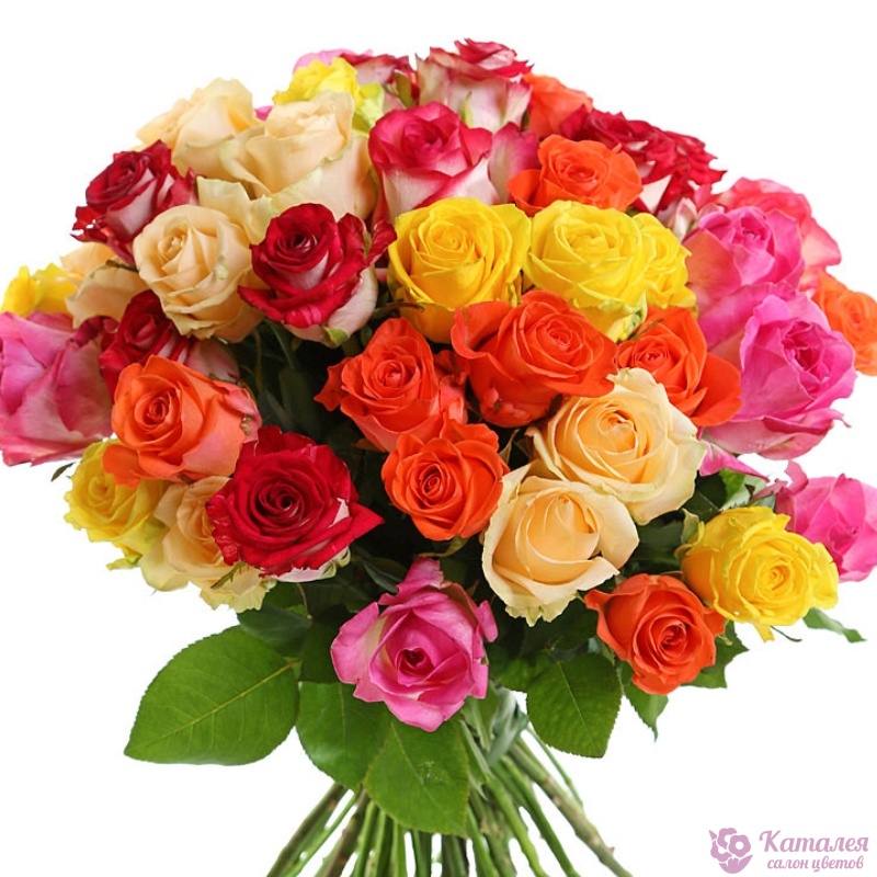 Букет состоит из MIX из 71 розы Кения, прозрачная упаковка, атласная лента.
