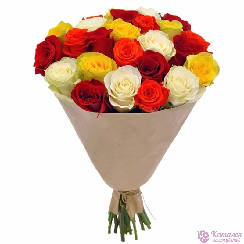 Букет состоит из MIX из 21 розы, крафт, атласная лента.