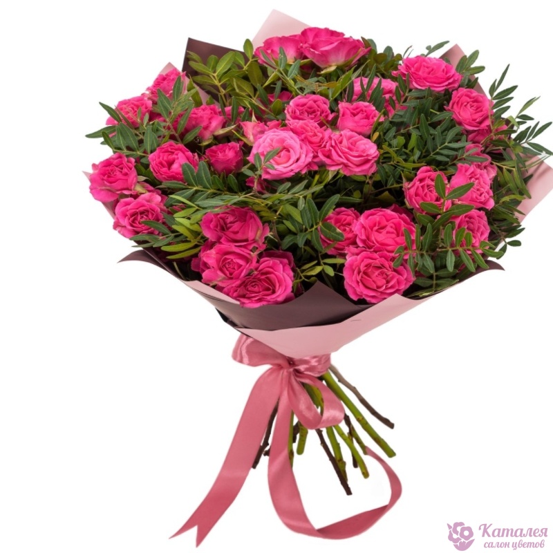 Букет состоит из 9 розовых кустовых роз, зелень, крафт, атласная лента.