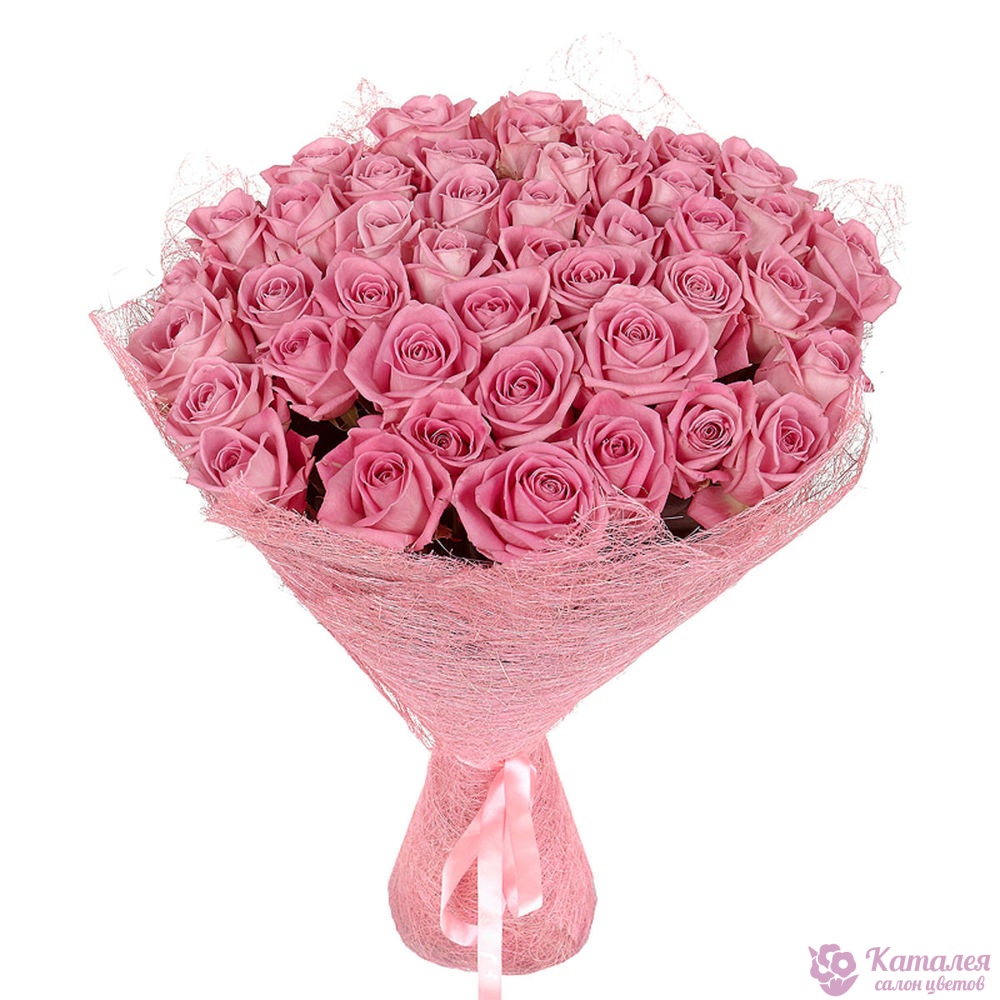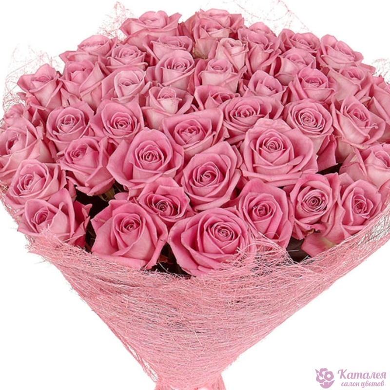 Букет состоит из 55 розовых роз, розовая упаковка, атласная лента.