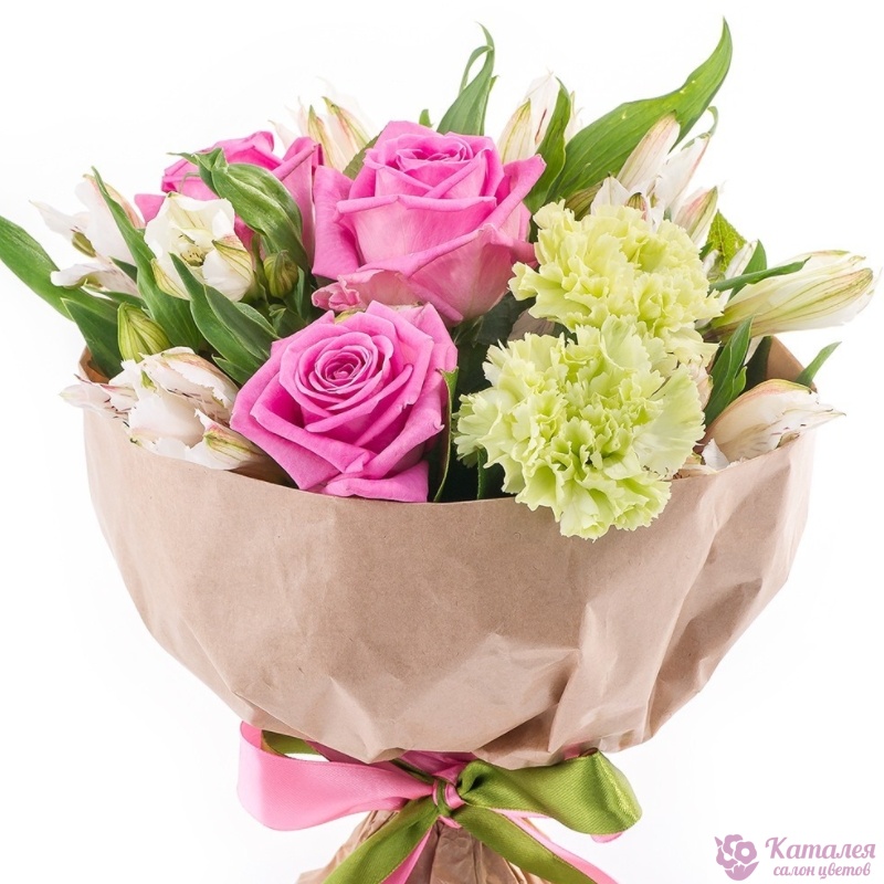 Букет состоит из 3 розы, 2 гвоздики, 4 альстромерии, крафт, атласная лента.