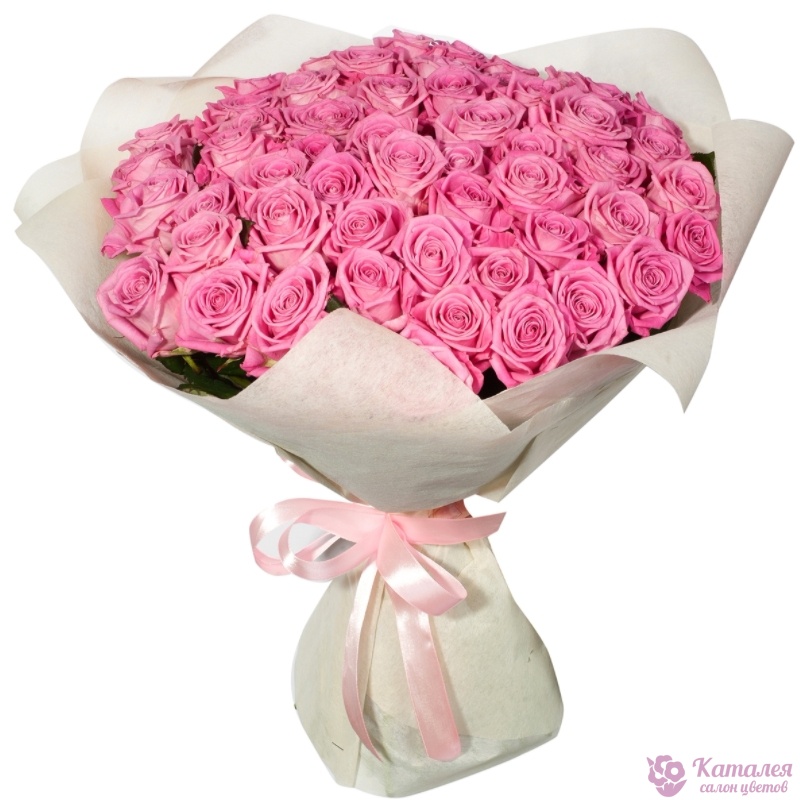 Букет состоит из 45 розовых роз, красивая упаковка, атласная лента.