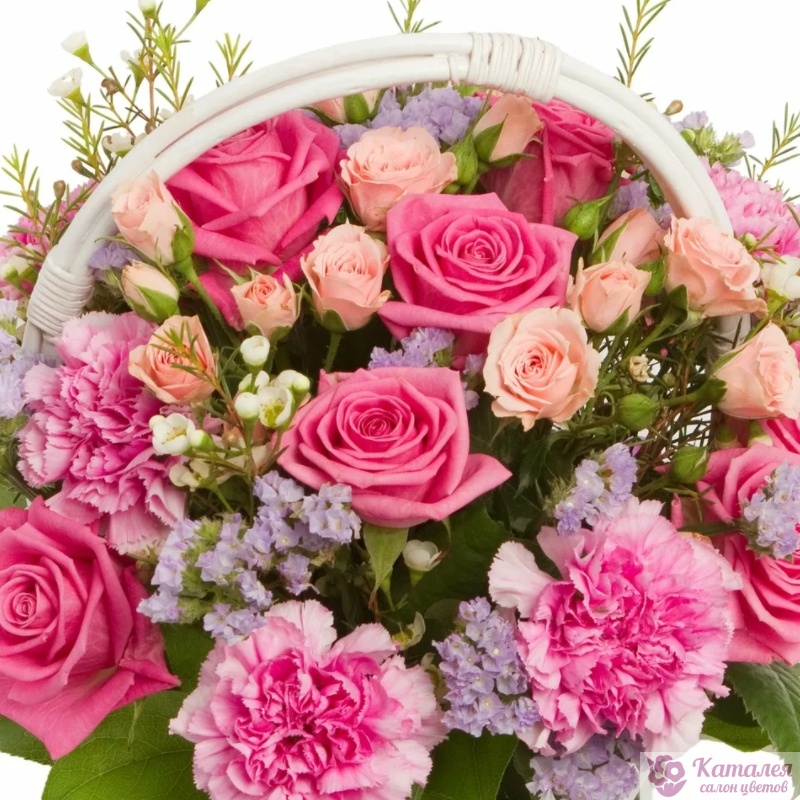 6 гвоздик, 3 ветки кустовой розы, 9 розовых роз, 6 статица, салал, корзина, оазис.