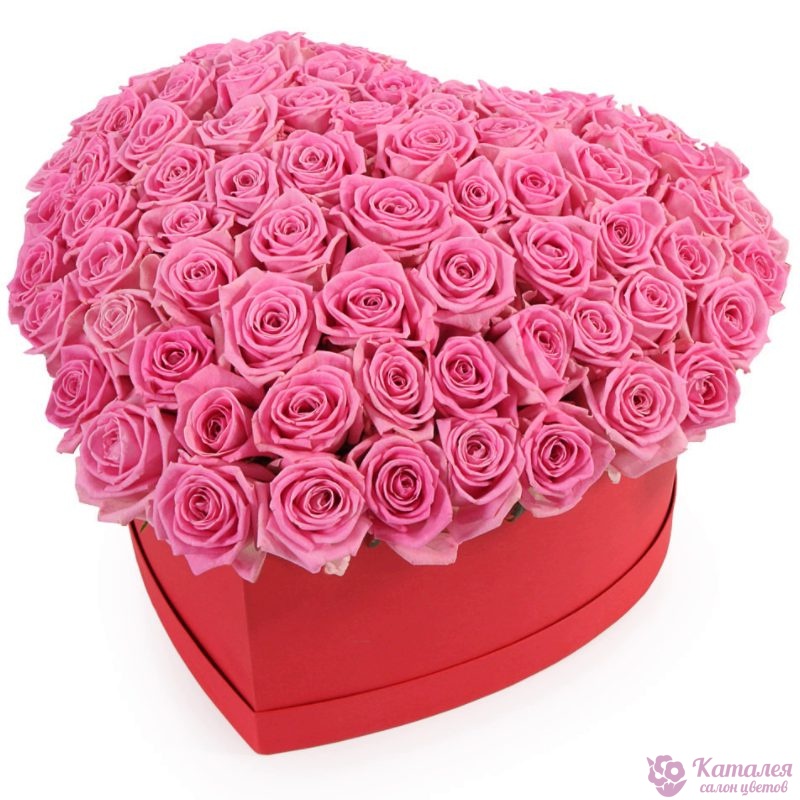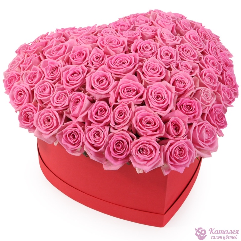 51 розовая роза, коробка в виде сердца.