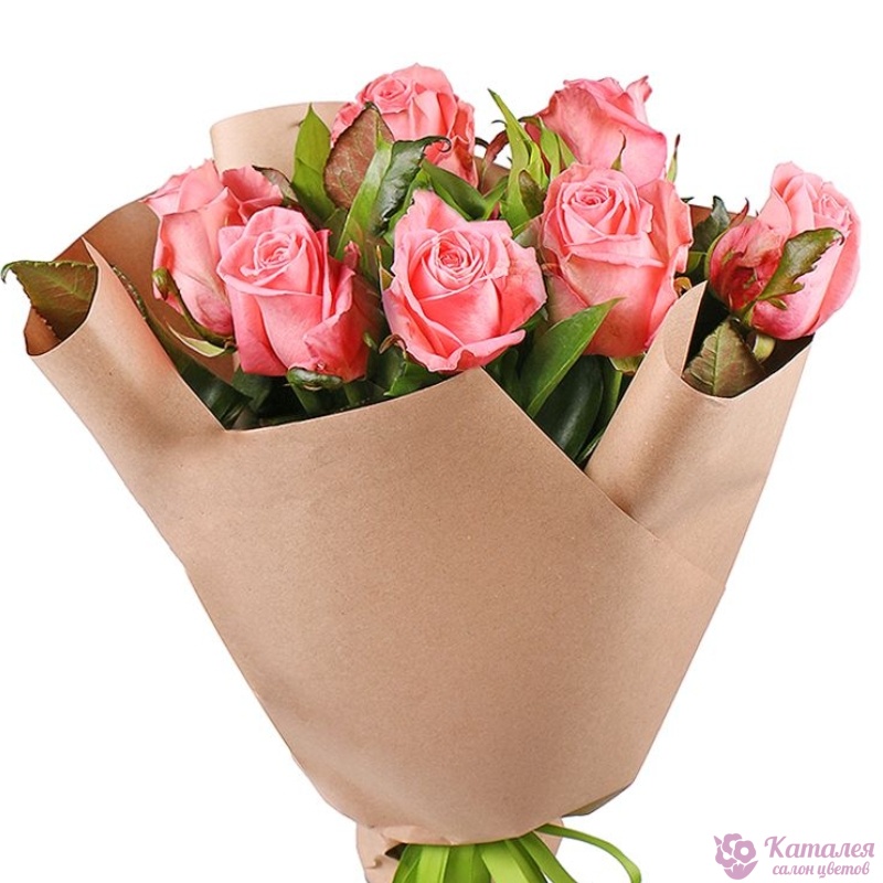 Букет состоит из 7 розовых роз, зелень, крафт, атласная лента.