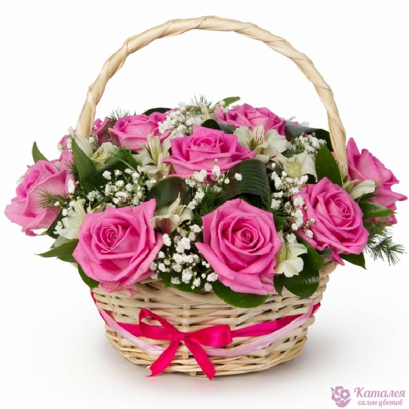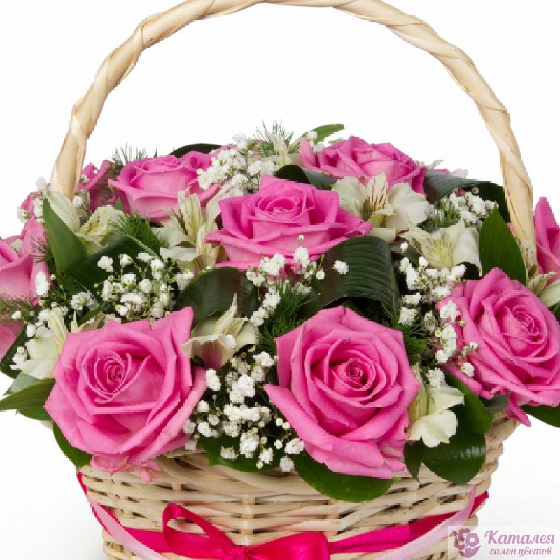 11 розовых роз, 2 ветки гипсофилы, зелень, корзина, оазис, атласная лента.