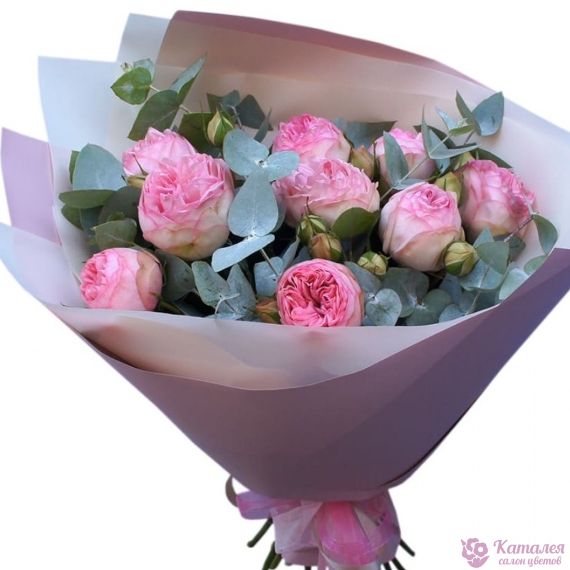 Букет состоит из 9 кустовых пионовидных роз, эвкалипт, красивая упаковка, атласная лента.