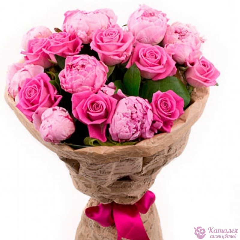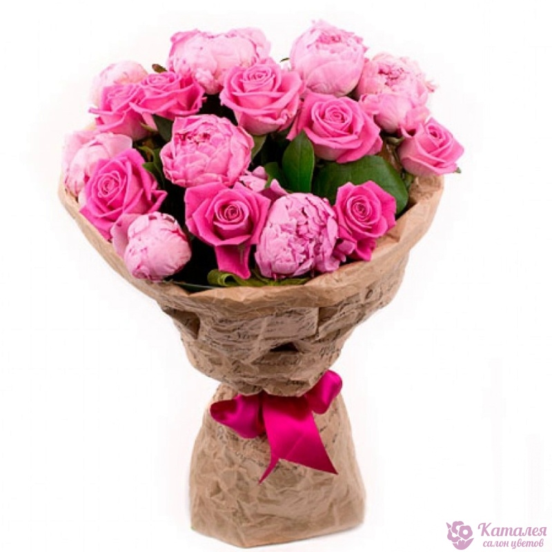 Букет состоит из 9 розовых роз, 8 пионов, зелень, крафт, атласная лента.