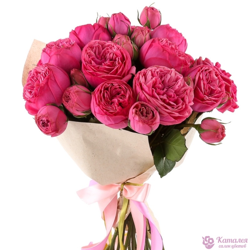 Букет состоит из 11 кустовых пионовидных роз, крафт, атласная лента.
