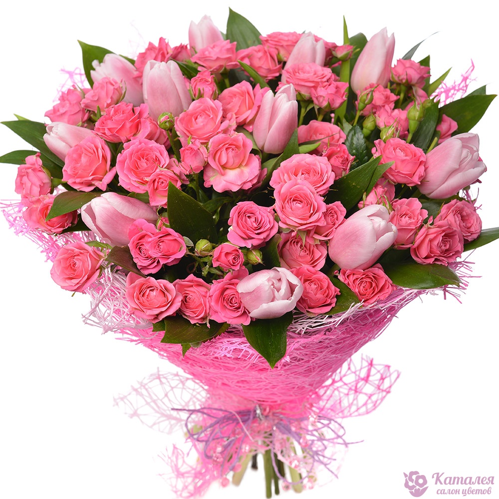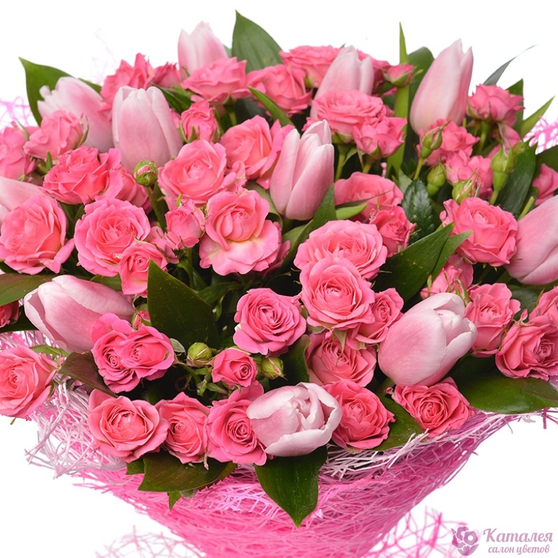 Букет состоит из 11 розовых тюльпанов, 10 веток розовой кустовой розы, зелень, розовая упаковка, атласная лента.