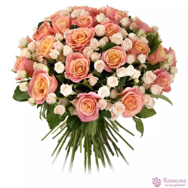 Букет состоит из 25 розовых роз, 15 кремовых кустовых роз, прозрачная упаковка, атласная лента.