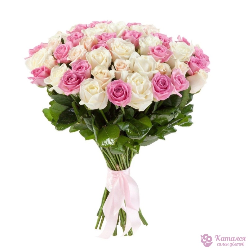 Букет состоит из 23 розовые розы, 22 белые розы, прозрачная упаковка, атласная лента.