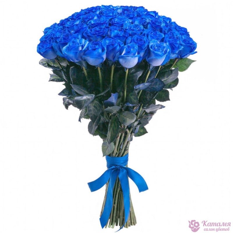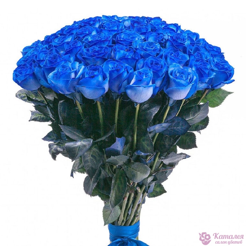 Букет состоит из 45 синих роз, прозрачная упаковка, атласная лента.