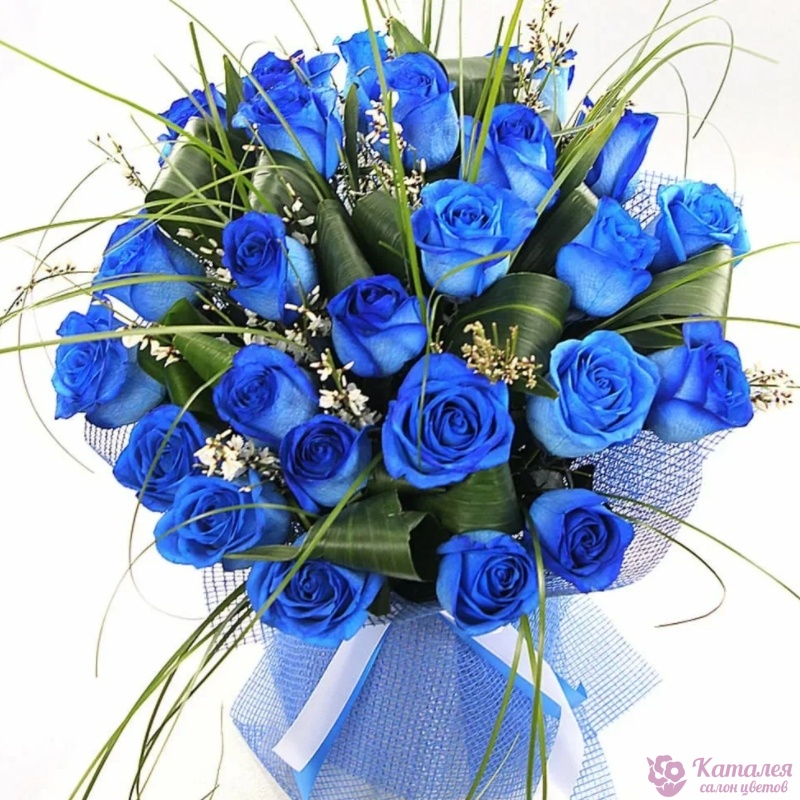 Букет состоит из 25 синих роз, аспидистра, зелень, красивая упаковка, атласная лента.