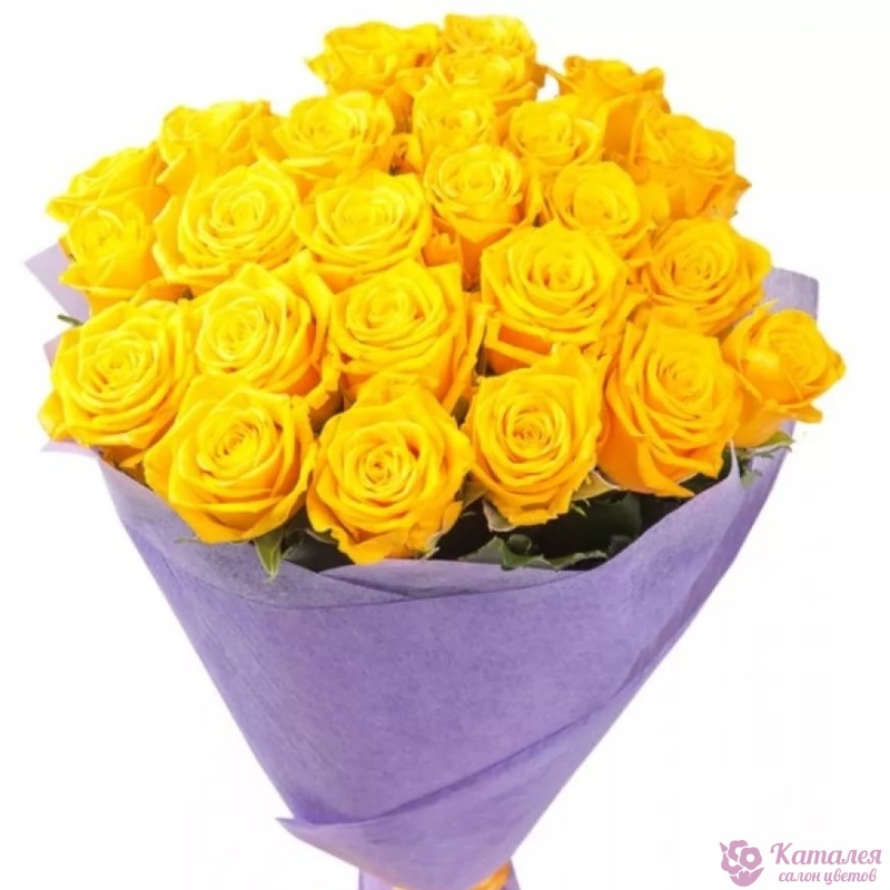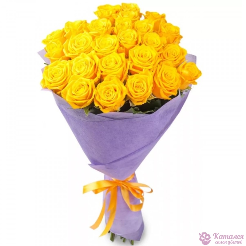 Букет состоит из 25 желтых роз, красивая упаковка, атласная лента.