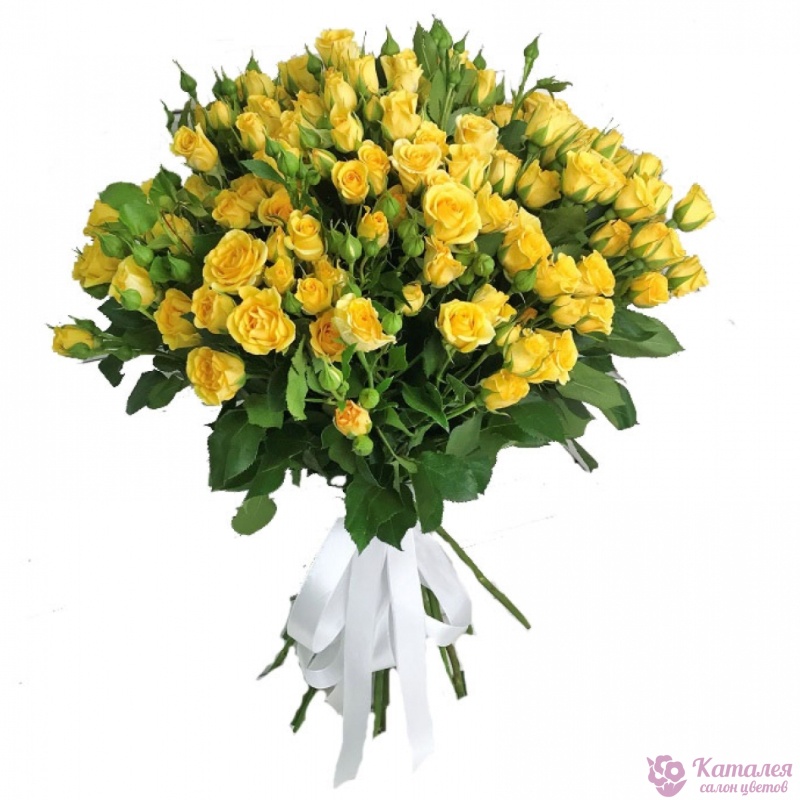 Букет состоит из 27 желтых кустовых роз, прозрачная упаковка, атласная лента.