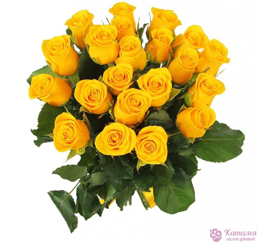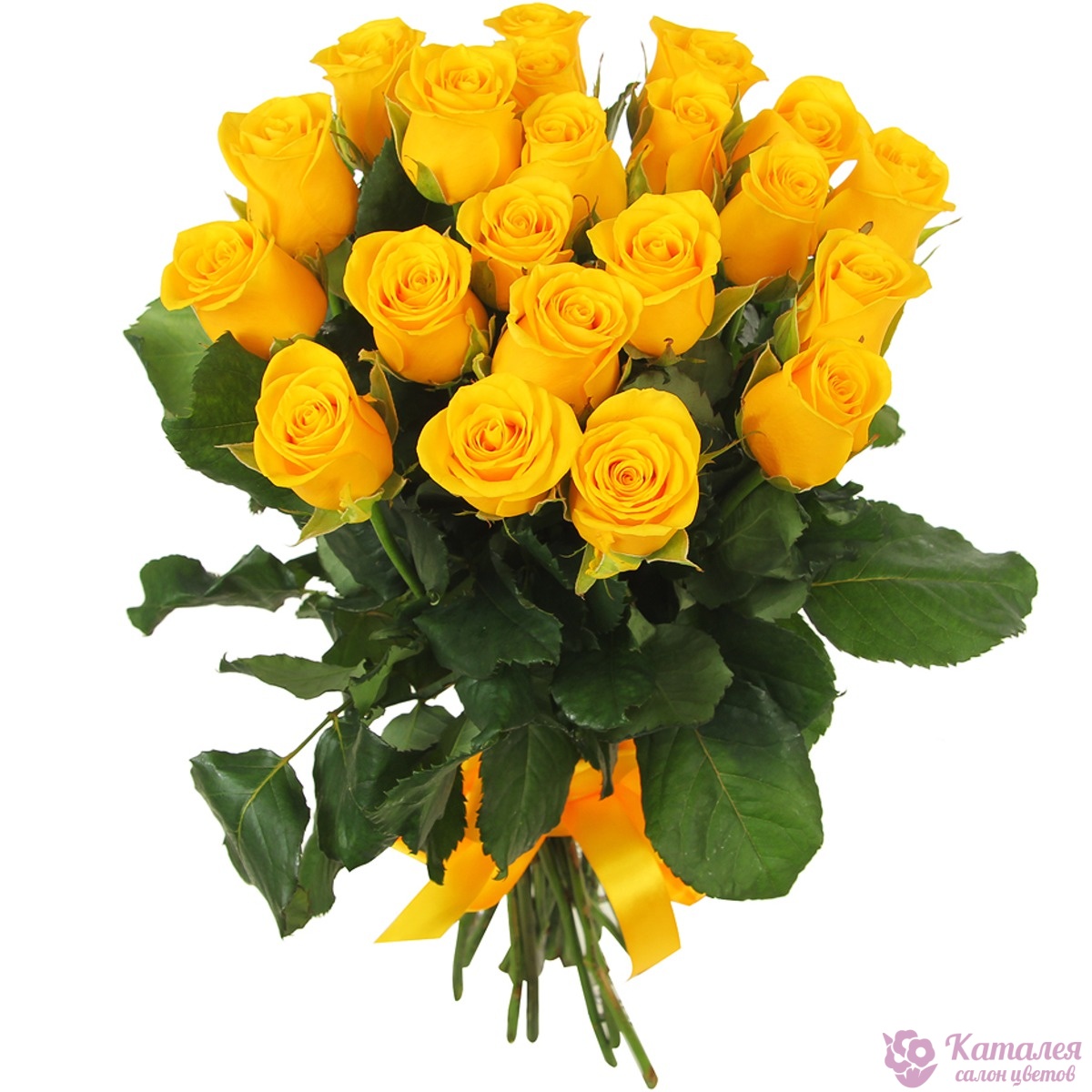 Букет состоит из 21 желтая роза, прозрачная упаковка, атласная лента.