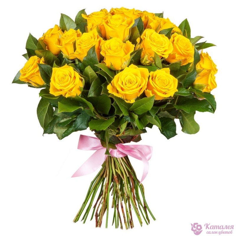 Букет состоит из 25 желтых роз, прозрачная упаковка, атласная лента.