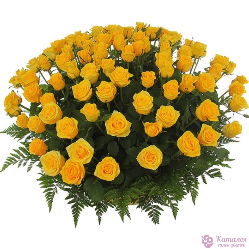 101 желтая роза, папоротник, корзина.