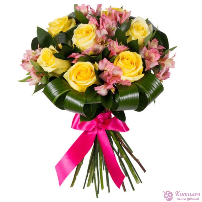 Букет состоит из 7 желтых роз, 7 веток розовой альстромерии, зелень, прозрачная упаковка, атласная лента.