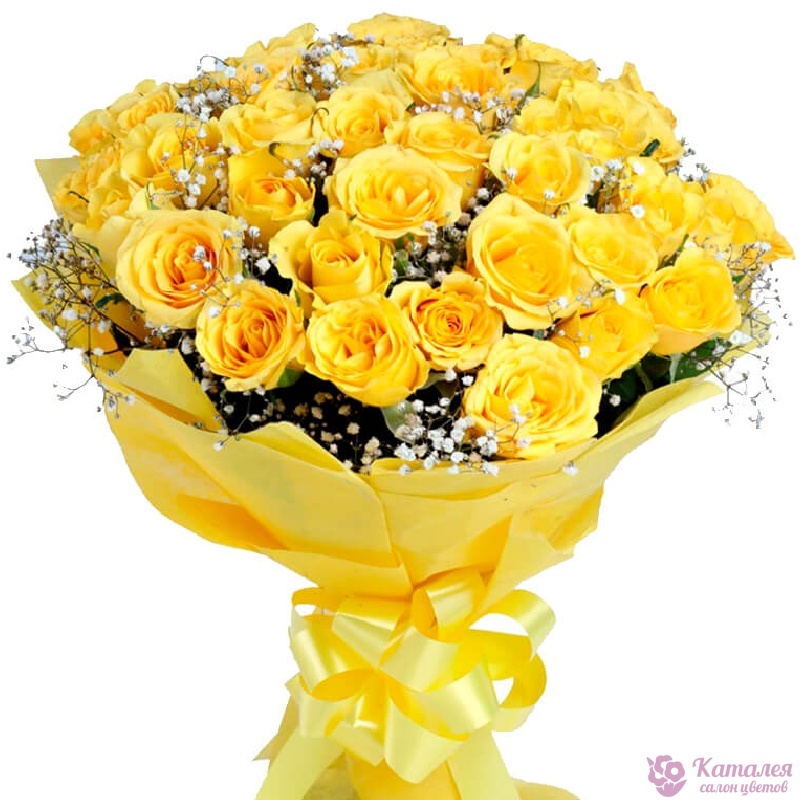 Букет состоит из 45 желтых роз, 4 ветки гипсофилы, красивая упаковка, атласная лента.