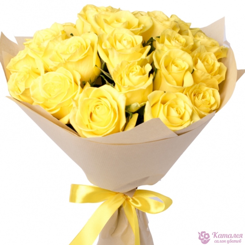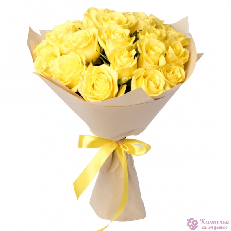 Букет состоит из 21 желтая роза, крафт, желтая лента.