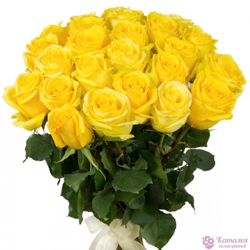 Букет состоит из 25 желтых роз, прозрачная упаковка, атласная лента.