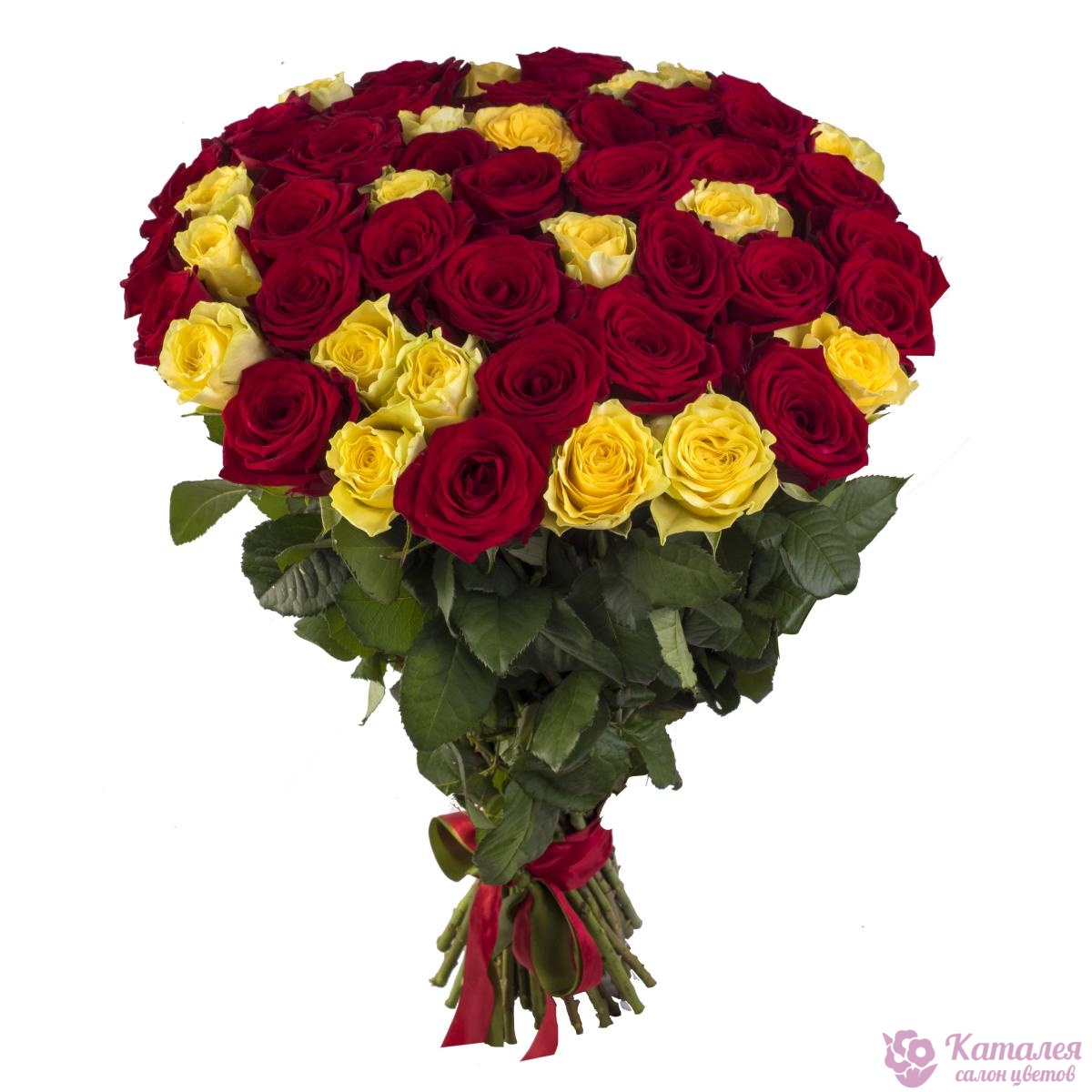 Букет состоит из 23 бордовые розы, 22 желтые розы, прозрачная упаковка, атласная лента.